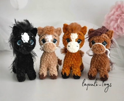 в мк входит описание вязания одноцветной лошадки, лошадки с пятнышками и единорожки
